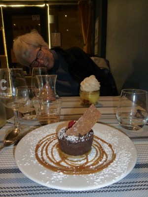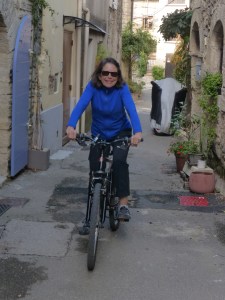 Love it!Mistral, resident greeter at the excellent Le Cercle Restaurant in Curcuron, on his way to workL’hermitage outside Curcuron, definitely worth the climb.Bonnieux – you can see foreverTerrace sitting – lovely Curcuron.Biking along medieval streets, along country lanes through fields of grape vines and olive trees; so grateful to spend two whole weeks living in Provence with my good friend, Jill.