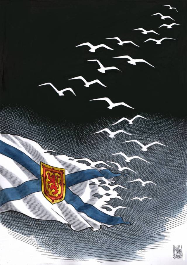 And one week ago, Nova Scotia was attacked violently and senselessly by a fiend impersonating an RCMP officer, driving a fully-marked car and wearing a uniform. Twenty-three innocent people lost their lives; countless family members, friends and community people are left devastated; all of this in very rural parts of our tiny province, areas previously most well-known for their peaceful, quiet beauty and friendly people. So many children and grandchildren left without parents and grandparents; there are no words for their kind of sadness. Support and messages of hope have flooded in from around the world, and Nova Scotians stand strong and united, but this is not the way those precious lives were supposed to end.(poignant art: Bruce MacKinnon,THE CHRONICLE HERALD)