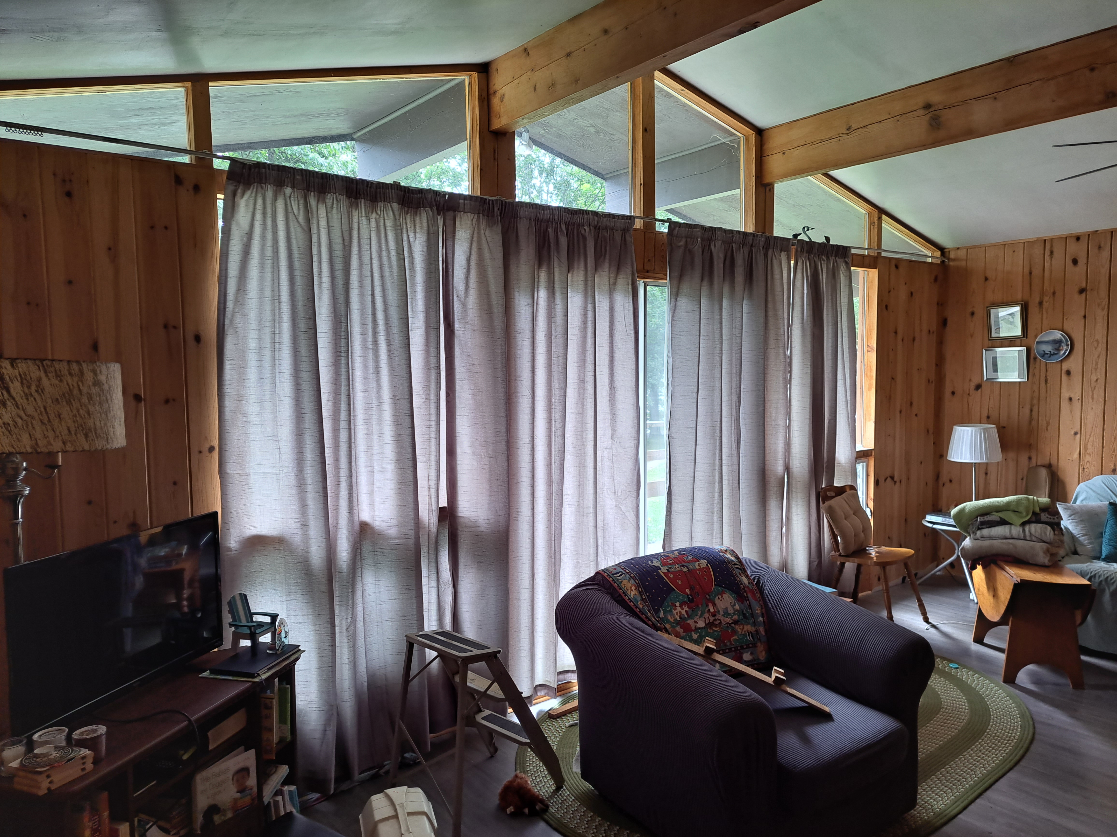 This is a very welcoming place to be, and I’ve so enjoyed our first summer in the Highlands. Haliburton only has about 1000 full-time residents, but there are over 500 lakes in the vicinity, so it’s bustling in the summer. Now that it’s fall, things will quiet down I expect. We just bought the cottage in the fall of 2022, so there’s always lots of work to do. The previous owner built it in 1975, and he basically left everything (EVERYTHING) here when he sold it. We’ve made lots of donations to SIRCH, the local community helper agency, and I’ve become a big fan of FB Marketplace, where I recently found these pinch-pleated drapes for $60, allowing me to get rid of the orange circa 1975 ones, but still use the existing tracks.